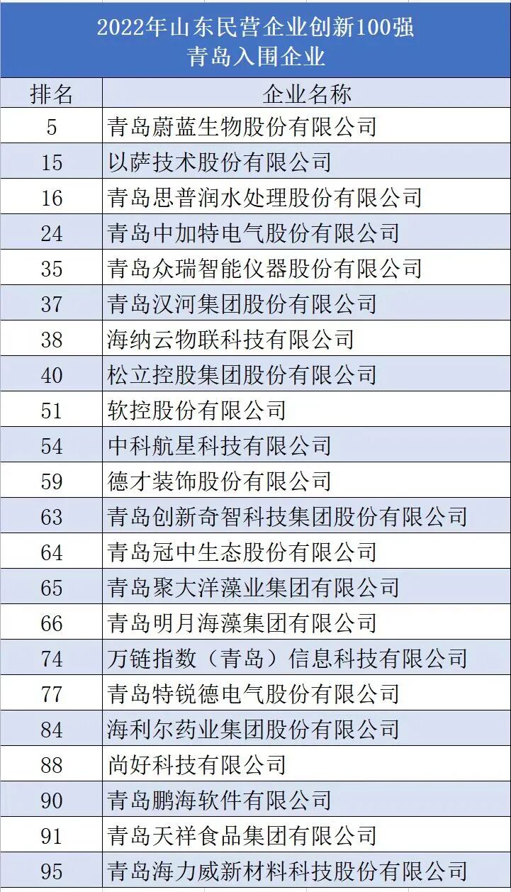 “創(chuàng)新100強(qiáng)”榜單,青島蔚藍(lán)生物股份有限公司等22家青島企業(yè)入圍,占全省比重超過五分之一;
