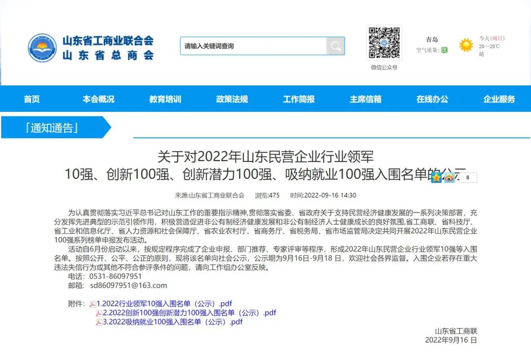 9月16日,山東省工商聯(lián)發(fā)布通知,對2022年山東民營企業(yè)行業(yè)領(lǐng)軍10強(qiáng)(共100家)、創(chuàng)新100強(qiáng)、創(chuàng)新潛力100強(qiáng)、吸納就業(yè)100強(qiáng)入圍名單進(jìn)行公示。