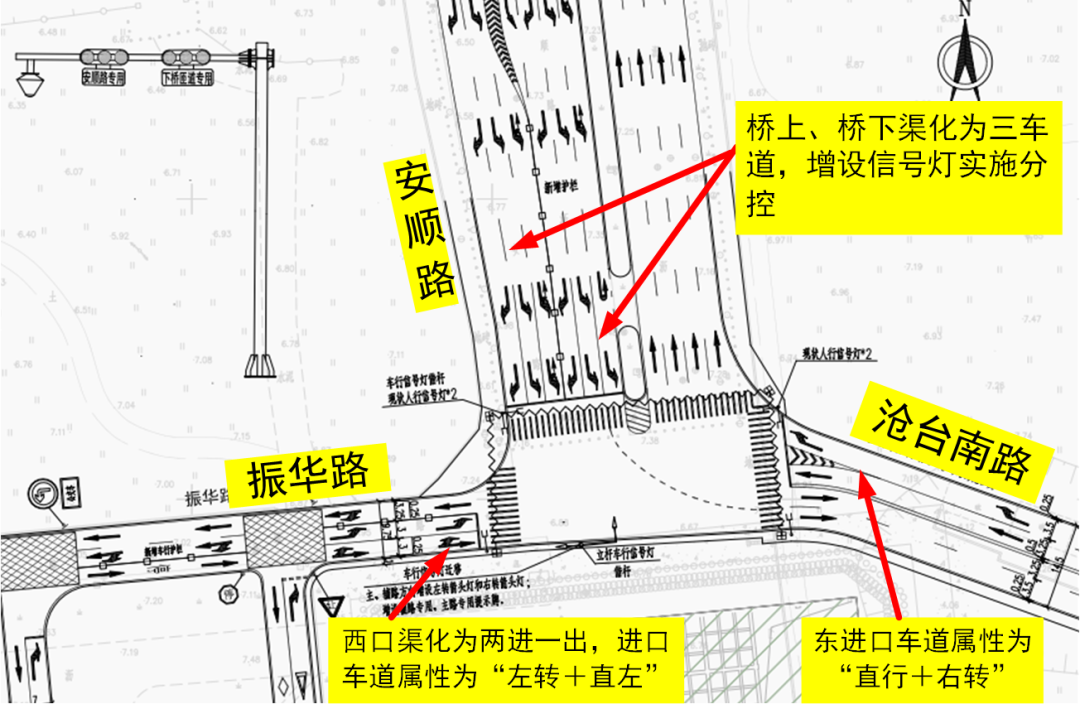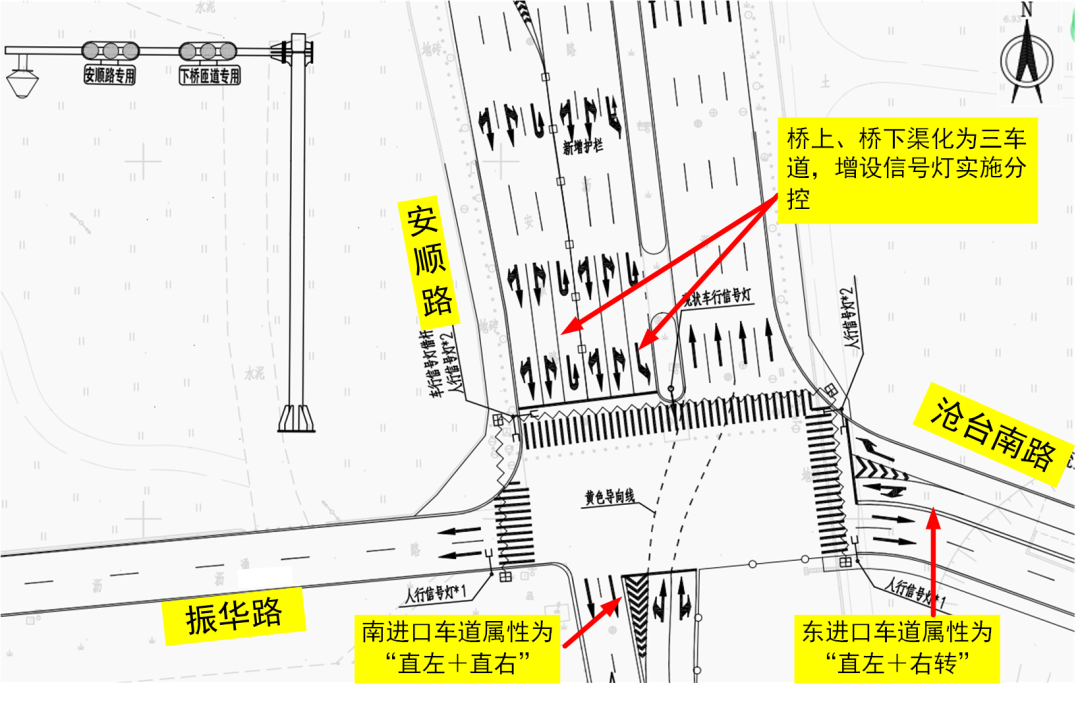 1、北進口橋上車道屬性為“左轉(zhuǎn)掉頭+直左+直右”,橋下車道屬性為“掉頭+直左+直右”,增設(shè)橋上、橋下信號燈實施分控,消除橋上掉頭往安順路北車輛與橋下左轉(zhuǎn)往滄臺南路車輛沖突;