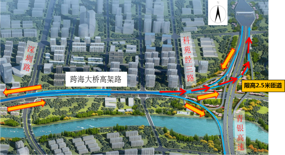現(xiàn)狀跨海大橋高架路主路車輛可由海爾路立交繼續(xù)向東行駛,經(jīng)深圳路東側(cè)平行匝道至地面輔路,西向北匝道至青銀高速,西向南匝道至遼陽(yáng)東路。其中,駛?cè)肭嚆y高速收費(fèi)站方向的西向北匝道受現(xiàn)狀高壓線凈空影響,匝道通行車輛高度暫限制在2.5米以內(nèi),后期高壓線入地后匝道通行取消限高?,F(xiàn)階段建議超高車輛從海爾路立交提前駛離,或沿西向南匝道駛離。