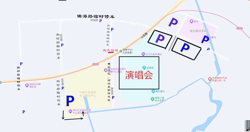 1、奧特萊斯、體育館東側(cè)1、2號(hào)停車區(qū)域、紅島國(guó)際會(huì)展中心停車場(chǎng)。