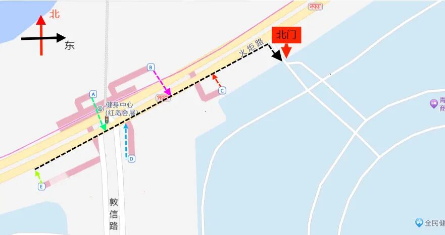 從地鐵8號(hào)線健身中心(紅島會(huì)展)站E出入口出站,沿火炬路向東步行過(guò)路口,繼續(xù)直行可到達(dá)青島市民健身中心體育場(chǎng)北門(mén)。