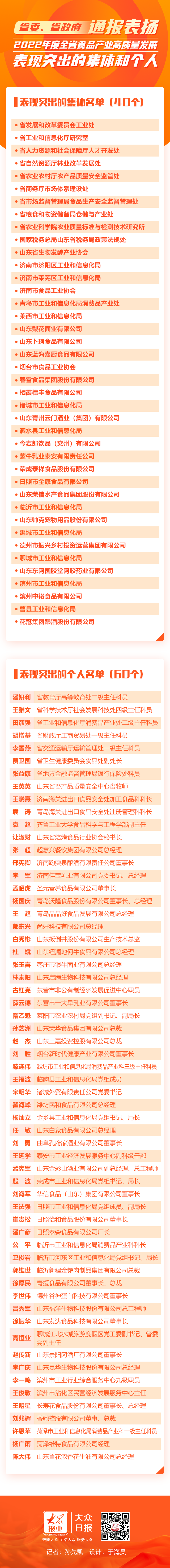 2022年,在以習近平同志為核心的黨中央堅強領(lǐng)導(dǎo)下,全省各級各部門各單位和食品戰(zhàn)線廣大黨員干部職工堅持以習近平新時代中國特色社會主義思想為指導(dǎo),深入學(xué)習貫徹黨的二十大精神,認真落實習近平總書記對山東工作的重要指示要求,錨定“走在前、開新局”,團結(jié)一心、攻堅克難,全省食品產(chǎn)業(yè)持續(xù)提質(zhì)增效,涌現(xiàn)出了一批推動食品產(chǎn)業(yè)高質(zhì)量發(fā)展的先進集體和個人。為充分發(fā)揮先進示范帶動作用,省委、省政府決定,對省發(fā)展和改革委員會工業(yè)處等40個表現(xiàn)突出的集體、潘妍利等60名表現(xiàn)突出的個人予以通報表揚。