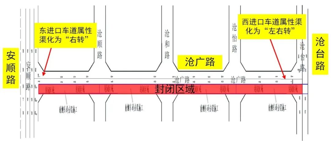 自2023年7月20日起至2023年8月20日滄廣路南半幅分段封閉施工,保留滄廣路雙向兩車道通行。西進(jìn)口車道屬性渠化為“左右轉(zhuǎn)”,東進(jìn)口車道屬性渠化為“右轉(zhuǎn)”。