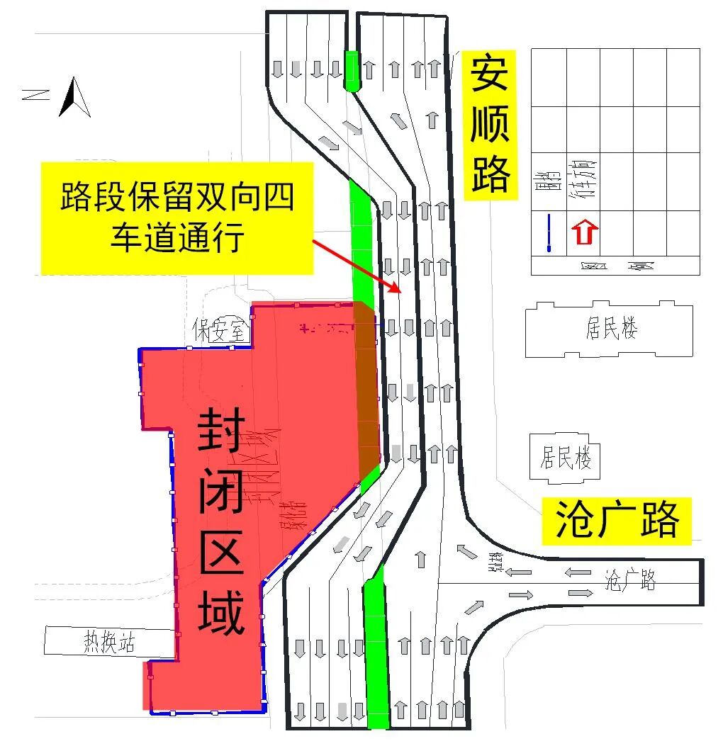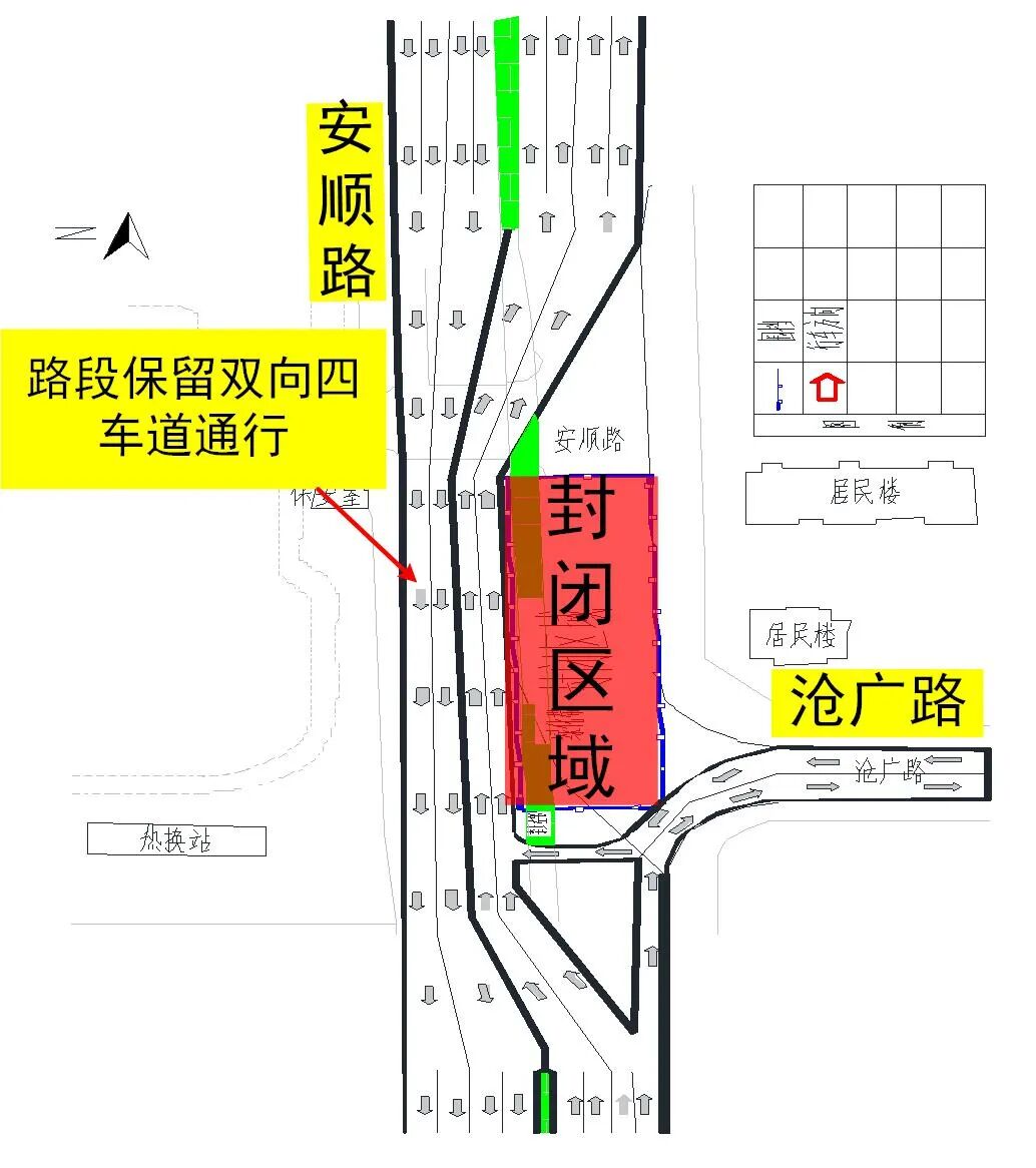 2.第二階段:自2023年8月15日起至2023年9月10日,占用安順路滄廣路路口北側(cè)安順路西半幅封閉施工,安順路保留雙向四車道通行。