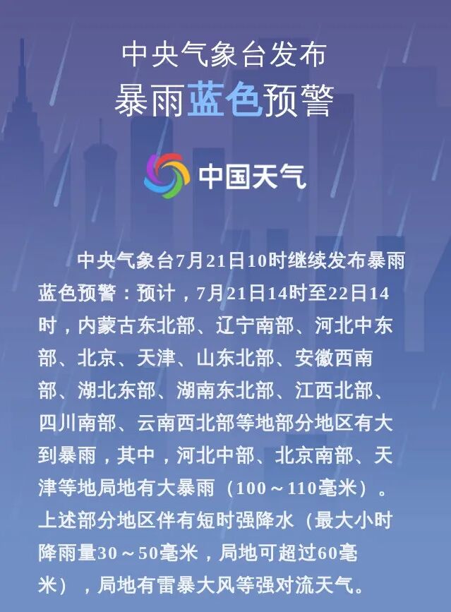 中央氣象臺7月21日10時繼續(xù)發(fā)布暴雨藍色預警:預計,7月21日14時至22日14時,內(nèi)蒙古東北部、遼寧南部、河北中東部、北京、天津、山東北部、安徽西南部、湖北東部、湖南東北部、江西北部、四川南部、云南西北部等地部分地區(qū)有大到暴雨。