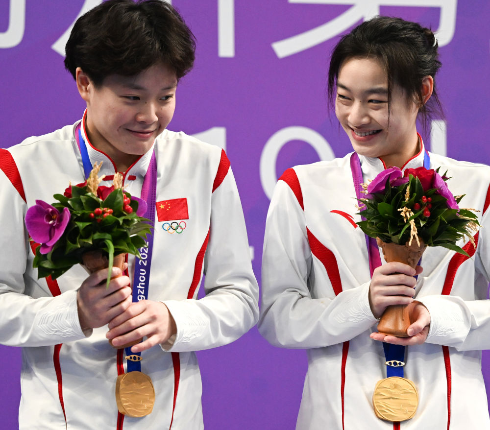 10月1日,冠軍中國(guó)組合陳藝文(左)/昌雅妮在頒獎(jiǎng)儀式上。當(dāng)日,杭州亞運(yùn)會(huì)跳水項(xiàng)目女子雙人3米跳板決賽在杭州奧體中心游泳館舉行。新華社記者 夏一方 攝