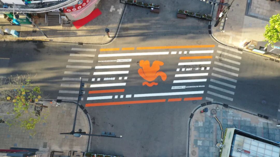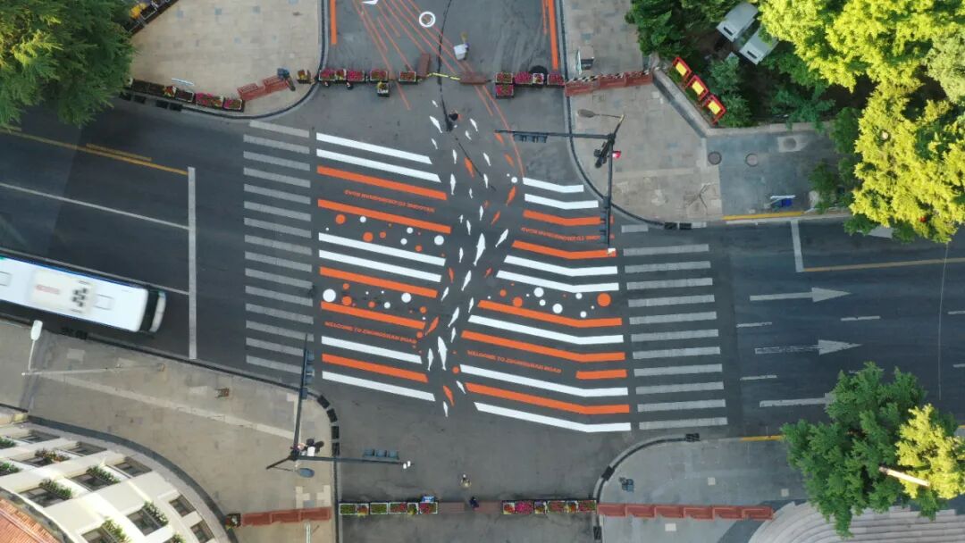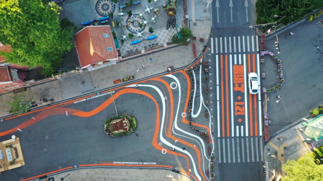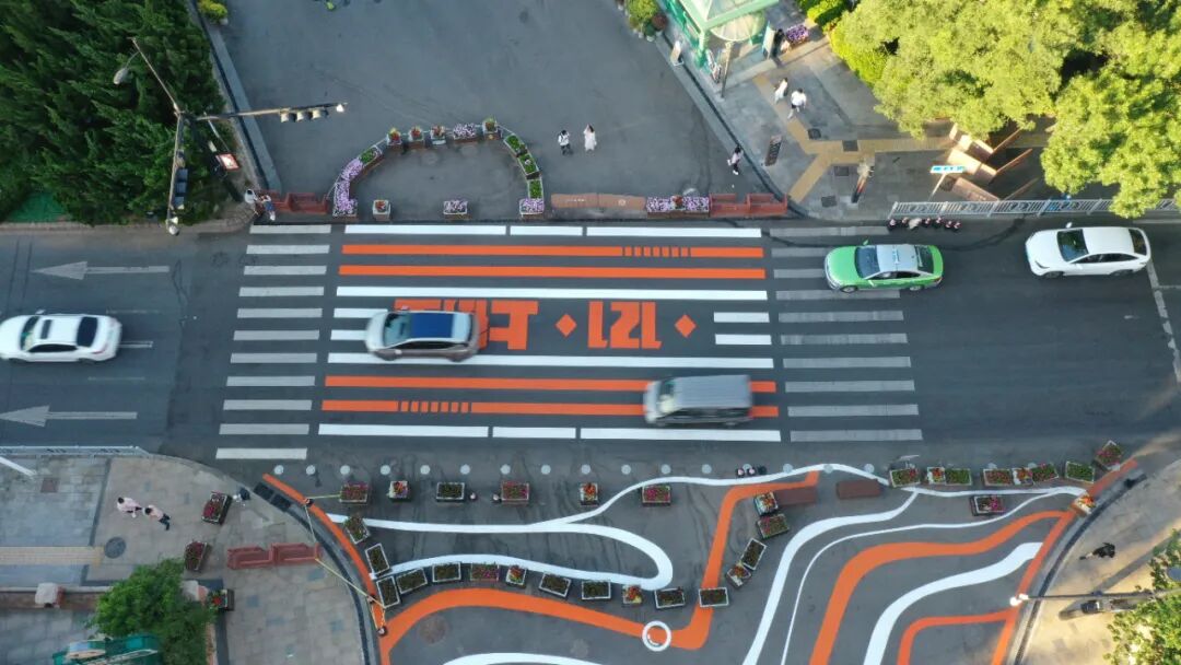 據(jù)了解,斑馬線延長方案旨在優(yōu)雅延展,緊密貼合原有路徑兩側(cè),流暢線條勾勒出安全與美學(xué)的雙重考量。色彩上精心挑選與中山路壹號建筑相得益彰的橙紅色調(diào),不僅與地標建筑色彩和諧共振,更營造視覺上的完美統(tǒng)一。
