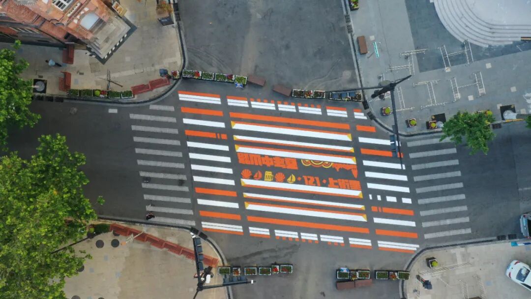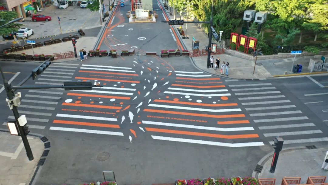青島日報社/觀海新聞6月27日訊 今天,記者在青島中山路探訪時發(fā)現(xiàn),中山路與蘭山路、廣西路、湖南路、湖北路交叉路口的斑馬線“大變樣”,橙白相間的斑馬線變得延長流暢,中間還增添了“121上街里”品牌標識、魚群海鷗浪花等圖案,為道路增添一抹生動活力,彰顯街區(qū)個性魅力。