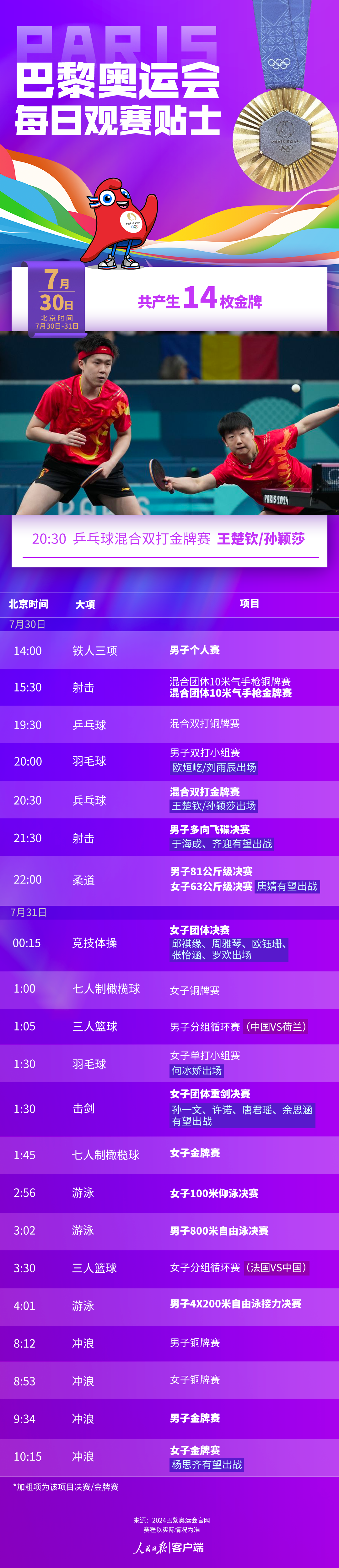 巴黎時(shí)間7月30日,巴黎奧運(yùn)會(huì)將在游泳、擊劍、乒乓球、射擊、體操、鐵人三項(xiàng)等項(xiàng)目產(chǎn)生14枚金牌?!吧^”組合混雙沖金,謝瑜再?zèng)_擊射擊團(tuán)體金牌,女子重劍隊(duì)能否重回巔峰,體操女團(tuán)力爭(zhēng)獎(jiǎng)牌,這些看點(diǎn)值得關(guān)注。