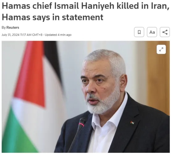 7月31日,哈馬斯政治局領(lǐng)導(dǎo)人伊斯梅爾·哈尼亞則在伊朗遭襲身亡。