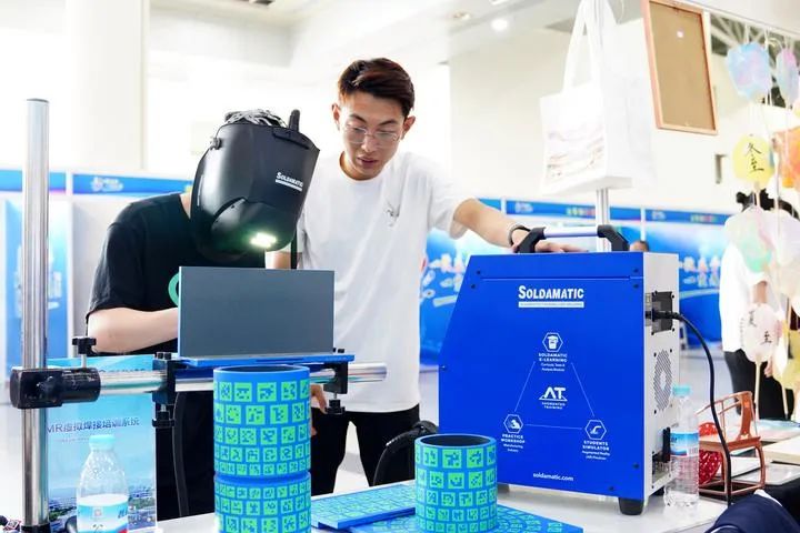 5月11日,在濟(jì)南舜耕國(guó)際會(huì)展中心濟(jì)南職業(yè)學(xué)院展臺(tái),一位同學(xué)在體驗(yàn)MR虛擬焊接培訓(xùn)系統(tǒng)。新華社記者 郭緒雷 攝
