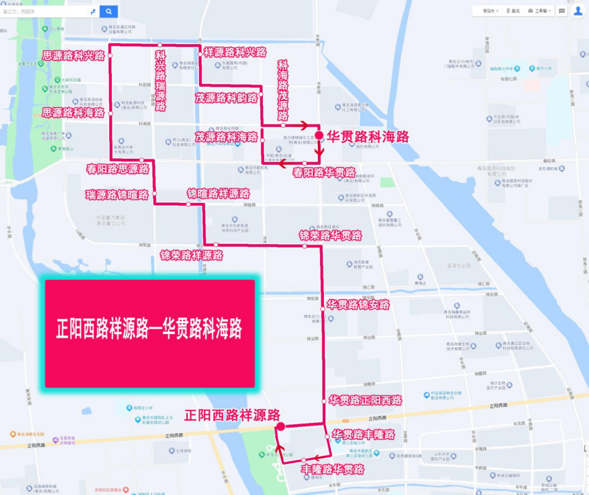 下行方向:由“正陽西路祥源路”發(fā)車,沿正陽西路、華貫路、錦榮路、祥源路、錦暄路、瑞源路、春陽路、思源路、科興路、祥源路、科韻路、茂源路、科海路、華貫路至“華貫路科海路”站止。
