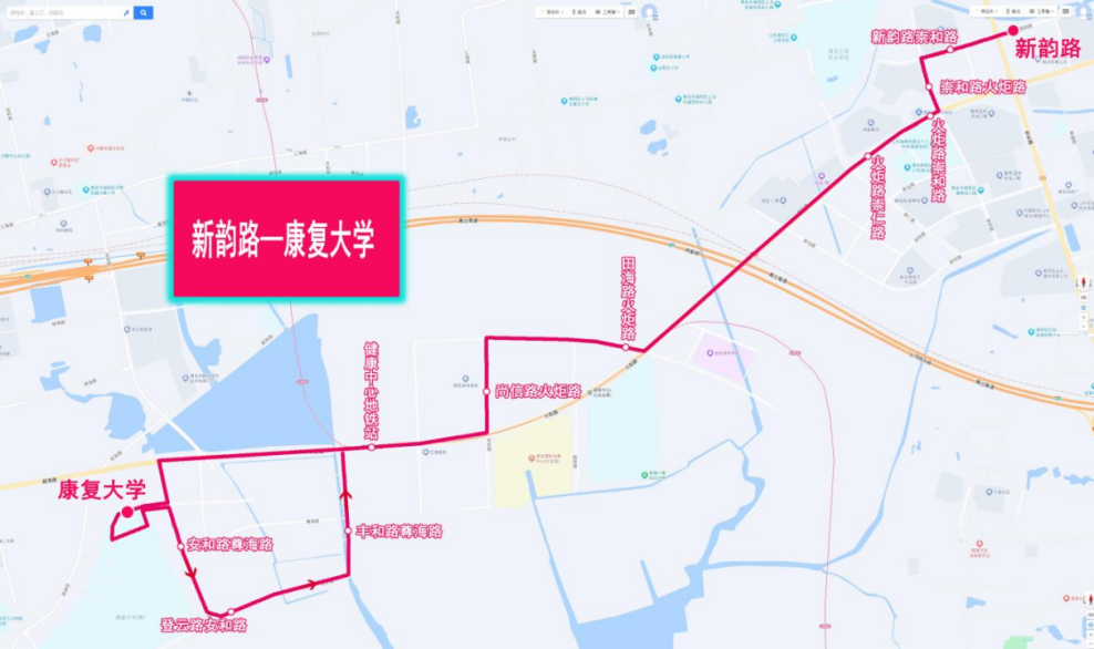 該線路主站為新韻路,副站為康復(fù)大學(xué)(因受校園內(nèi)部道路施工暫將副站康復(fù)大學(xué)調(diào)整至校園門口的安和路西側(cè)距離火炬路約220米處設(shè)置,待施工結(jié)束后啟用該站點(diǎn))。