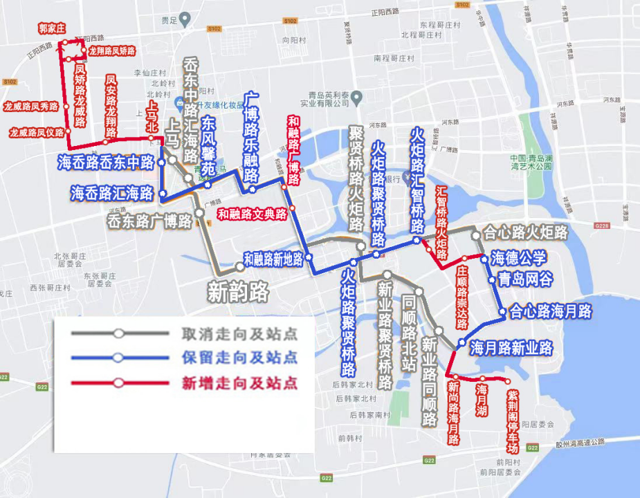 增設(shè)站:紫荊閣停車場(雙向并779路)、海月湖(雙向并779路)、新尚路海月路(雙向并779路)、海月路新業(yè)路(下行并779路)、合心路海月路(下行并779路)、青島網(wǎng)谷(下行并779路)、海德公學(xué)(下行并779路)、莊順路崇達(dá)路(雙向新增)、匯智橋路火炬路(雙向新增)、火炬路匯智橋路(下行并761路)、和融路新地路(下行并779路)、和融路文典路(下行新增)、和融路廣博路(上行并120路)、上馬北(雙向并945路)、鳳安路龍翔路(雙向并945路)、龍威路鳳儀路(雙向并951路)、龍威路鳳秀路(雙向并951路)、郭家莊(僅下行并901路,受龍翔路施工影響,此站點(diǎn)臨時取消,待道路施工結(jié)束啟用該站點(diǎn))、龍翔路鳳矯路(僅上行新增,受龍翔路施工影響,此站點(diǎn)臨時取消,待道路施工結(jié)束啟用該站點(diǎn))、鳳矯路龍威路(僅上行新增,受龍翔路施工影響,此站點(diǎn)臨時取消,待道路施工結(jié)束啟用該站點(diǎn))。