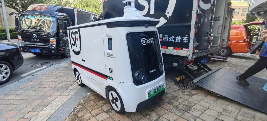 記者在位于古田路上的順豐速運營業(yè)部看到,無人駕駛快遞車與順豐廂式貨車、三輪快遞車并排停放在一起。上午10時30分左右,當裝載著貨物的貨車完成卸貨后,部分快遞將被放入這輛無人駕駛快遞車中,小車按照系統(tǒng)內(nèi)置的路線,行駛到指定區(qū)域,與順豐快遞小哥進行貨物的交接。