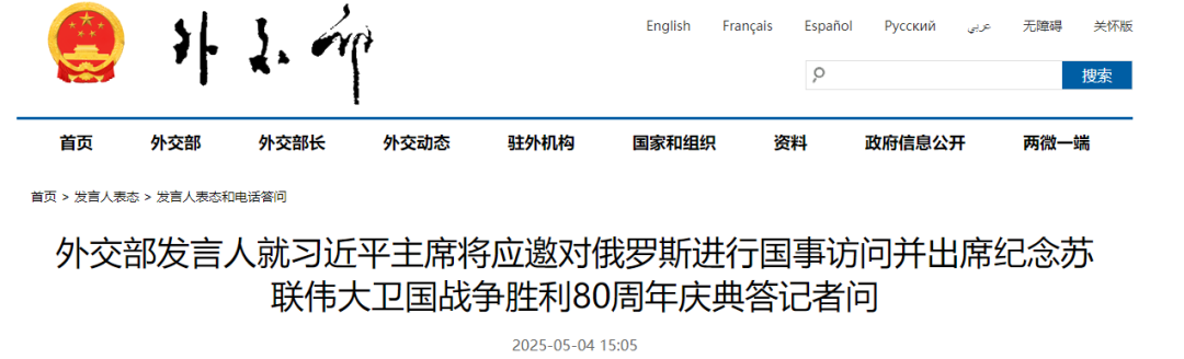 據(jù)外交部網(wǎng)站4日消息,外交部發(fā)言人就習近平主席將應邀對俄羅斯進行國事訪問并出席紀念蘇聯(lián)偉大衛(wèi)國戰(zhàn)爭勝利80周年慶典答記者問。