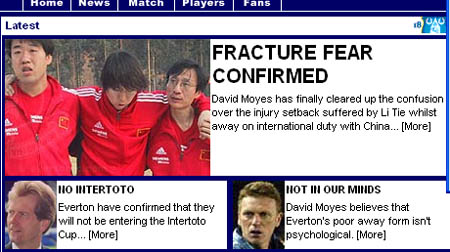 官方網(wǎng)站的報(bào)道中還稱(chēng),上周五來(lái)自中國(guó)的最初報(bào)道說(shuō),李鐵在一次訓(xùn)練中與國(guó)家隊(duì)隊(duì)友楊璞相撞而受傷,但在此后的一段時(shí)間里,從來(lái)自東方的各種新聞報(bào)道來(lái)看,他的傷勢(shì)似乎還比較樂(lè)觀,只需要幾周的時(shí)間他就可以重返賽場(chǎng)。然而,當(dāng)埃弗頓的隊(duì)醫(yī)最終在周三與李鐵取得聯(lián)系后,他們卻被告知能過(guò)對(duì)他的傷腿進(jìn)行X光拍片,發(fā)現(xiàn)他的腿骨已經(jīng)骨折。在此之前,當(dāng)莫耶斯在獲悉李鐵的骨折并沒(méi)有想像中那么嚴(yán)重,只是閉合性骨折后,曾非常欣慰地說(shuō):“這是一個(gè)好消息,他僅僅需要休息3、4周就可以回到賽場(chǎng)了。