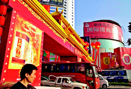 10月8日,一家白酒生產(chǎn)企業(yè)在濟南市經(jīng)一路上搭起跨街廣告牌坊。10月11日,2005年秋季全國糖酒商品交易會將在濟南市舉行,來自全國各地的參展商們在展會開始前就開始 了廣告大戰(zhàn)。本屆交易會有1200家企業(yè)參展,預(yù)計到會客商10萬人左右,商品成交額將超過100億元。新華社發(fā)