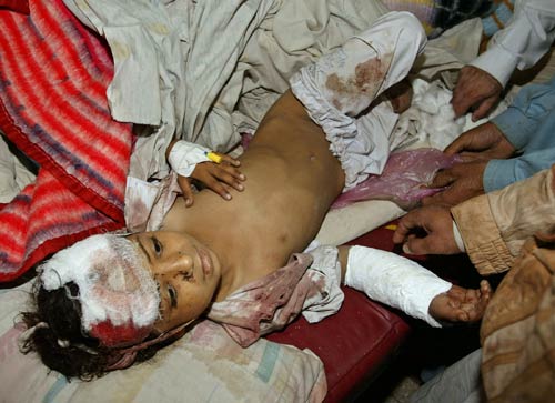 在巴基斯坦的曼塞赫拉,一名在地震中受傷的兒童被送進了當地的一所醫(yī)院。