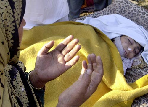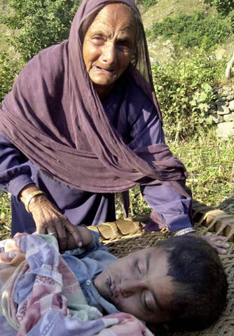在巴基斯坦西北邊境省的巴拉果德,薩達爾望著在地震中死去的孫子伊姆蘭悲痛不已。