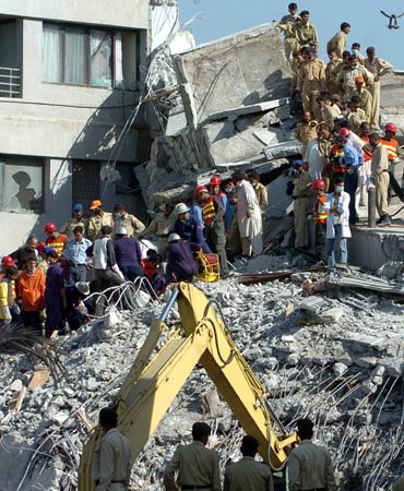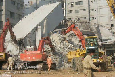 在8日發(fā)生的強烈地震中,巴基斯坦首都伊斯蘭堡一座10層的公寓樓發(fā)生坍塌,數百人被壓埋在瓦礫堆中。目前,20多臺重型機械設備正在現場輪番挖掘殘垣,爭取盡快搜救出受