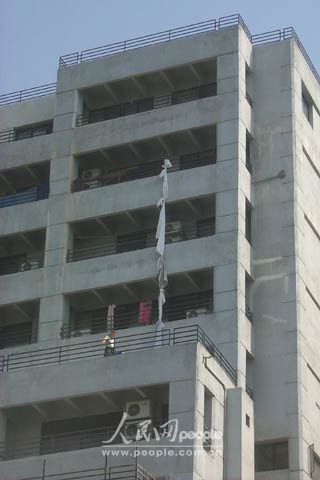 另一座樓中的居民在地震中用床單等物綁成繩索,準備順窗爬下逃生。