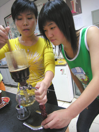 2.調(diào)酒師需要“十八般武藝”樣樣精通,這不,雪艷正學(xué)習(xí)咖啡制作呢!斑@咖啡看上去雖然都是黑黑的一小杯差不多少,真沒想到里面的門道這么多!”