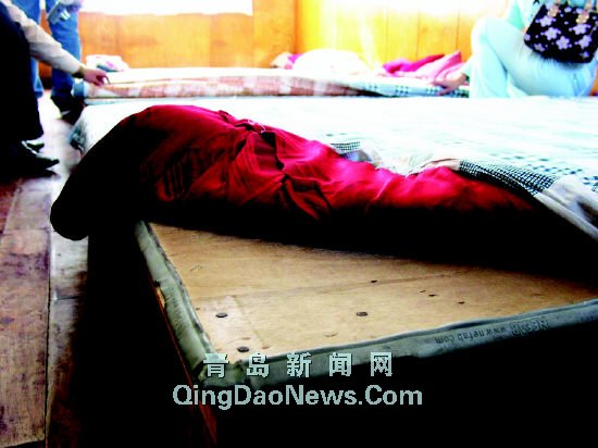 旁邊的休息室更是讓人無(wú)法接受。大房間里除了一張單人床,其余的五張簡(jiǎn)易床就擺在地上,木板上只鋪著一床薄褥,每張簡(jiǎn)易床都擺著六、七個(gè)小枕頭,“這是床嗎?”這里的簡(jiǎn)陋程度讓執(zhí)法人員連連搖頭。