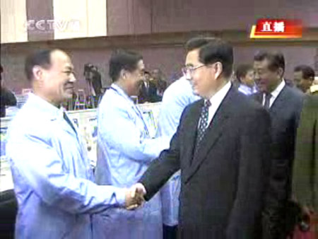 中新網(wǎng)10月12日電 胡錦濤等中央領(lǐng)導(dǎo)同志與北京航天飛行控制中心工作人員親切握手,熱烈祝賀神舟六號(hào)發(fā)射成功。