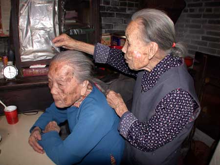 讓人眼前一亮的是,兩位老人雪白稀疏的頭發(fā)上都纏著鮮艷的紅繩。也許,在冥冥之中,的確有一條命運(yùn)的紅繩將這兩個(gè)女人拴在了一起。