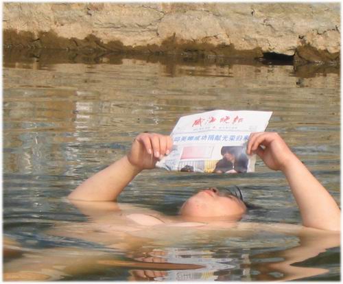 上午10時許,記者在現(xiàn)場看到,身穿泳褲的張輝進(jìn)入水中,開始了水上漂浮功夫的表演。只見他在水面上慢慢穩(wěn)定身體,然后將雙手抱在腦后,頭、腹部以及雙足露出水面,整個人一動不動地漂浮在水面上。隨后,他還表演了漂浮在水上讀報等節(jié)目。30分鐘后,張輝返回岸邊,在工作人員的幫助下,在雙腿上分別綁了一塊事先特制的大理石塊,每塊大約1.5公斤左右,之后他再次下水,為現(xiàn)場觀眾表演了水中行走功夫。記者看到,張輝到達(dá)指定區(qū)域后,劃動雙臂將身體在水中直立起來,然后雙臂抱胸,自西向東開始了水下行走。水中的張輝只將頭部露出水面,上身保持不動,全憑雙足在水中交替前行,不過行走的速度很慢,大約一分多鐘的時間里,他的身體只移動了三四米。