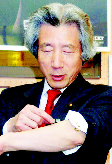 18日,日本首相小泉純一郎在東京的一家企業(yè)視察時試用一種注射用針頭。這種針頭直徑0.2毫米,據(jù)稱是世界上最細(xì)的針頭。新華社發(fā)