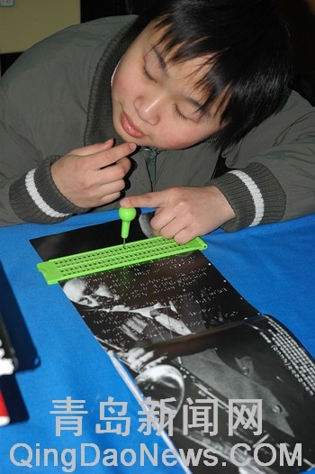 盲校孩子在舊掛歷上練習(xí)盲文(青島新聞網(wǎng) 王國強(qiáng) 攝)