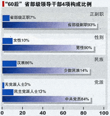 ????截至2008年4月,據(jù)不完全統(tǒng)計(jì),中央和各省、直轄市、自治區(qū)兩級(jí)政府中共有“60后”省部級(jí)領(lǐng)導(dǎo)干部71人。其中,女性7人(均為省部級(jí)副職),約占10%;少數(shù)民族10人,約占14%;民主黨派和無(wú)黨派人士11人,約占16%;省部級(jí)正職5人,約占7%,包括湖南省省長(zhǎng)周強(qiáng)、河北省代省長(zhǎng)胡春華、新疆自治區(qū)主席努爾·白克力、農(nóng)業(yè)部部長(zhǎng)孫政才和國(guó)防科工委主任張慶偉,最年輕的是同為45歲的胡春華和孫政才,張慶偉和努爾·白克力都是47歲,周強(qiáng)48歲。