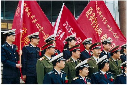 2003年4月,非典疫情爆發(fā),醫(yī)院組建了13人抗非典醫(yī)療隊(duì)支援北京,并積極做好青島市的各項(xiàng)抗非防疫工作,取得了突出成績(jī)。圖為下鄉(xiāng)抗非醫(yī)療隊(duì)成立。