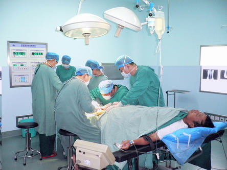 ???????401醫(yī)院積極開展新業(yè)務(wù)、新技術(shù)。自2003年開展肝臟移植手術(shù)以來,已成功完成60余例手術(shù),居山東省第二位。圖為肝臟移植手術(shù)現(xiàn)場。