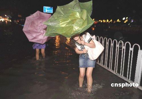 7月19日凌晨,今年第6號(hào)臺(tái)風(fēng)“莫拉菲”在深圳大鵬半島登陸,強(qiáng)度達(dá)到13級(jí),以每秒38米的速度西移。深圳狂風(fēng)大作,暴雨驟下,臺(tái)風(fēng)致許多樹木折斷,無人員傷亡報(bào)告。圖為兩女孩頂風(fēng)趟水前行(中新社發(fā) 陳文 攝)