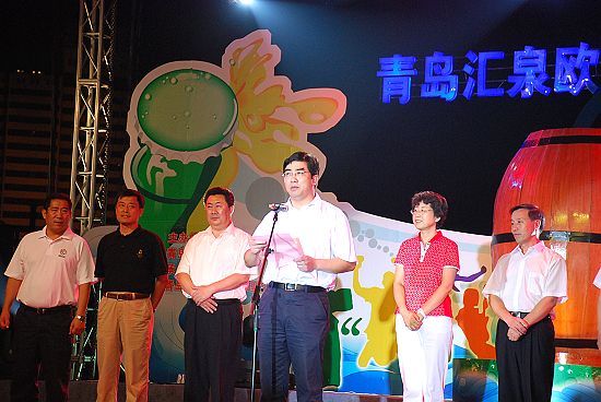 市南區(qū)區(qū)長(zhǎng)萬(wàn)建忠在歐陸啤酒廣場(chǎng)開(kāi)幕儀式上致辭 (記者龐為 攝)