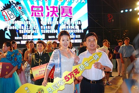 總冠軍歌手王佳妮和自己獲得的獎(jiǎng)品一輛轎車合影