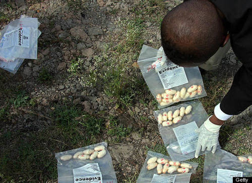 肯尼亞一名官員正在檢查收繳的海洛因和可卡因。
