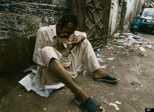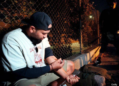 洛杉磯一名無(wú)家可歸的男子正注射海洛因。
