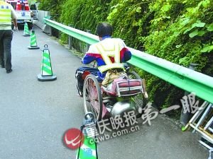 李遠(yuǎn)倫搖著三輪自行車在高速上行駛 記者 楊帆 攝