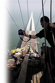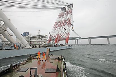 ????昨日下午,在海灣大橋滄口航道橋東側(cè)一段,2600噸起重船 “四航奮進(jìn)號(hào)”將海灣大橋最后一片60米預(yù)制箱梁吊裝到位。據(jù)介紹,60米整孔預(yù)制箱梁,頂板寬17米,底板寬6.6米,高3.5米,重量約2050噸,在中國(guó)同類結(jié)構(gòu)橋梁中排在前列,為長(zhǎng)江以北最大的整孔預(yù)制箱梁,預(yù)制和架設(shè)過程技術(shù)要求高,施工難度大。其吊裝高度超過杭州灣大橋,為目前國(guó)內(nèi)特大預(yù)制安裝箱梁的最大高度。