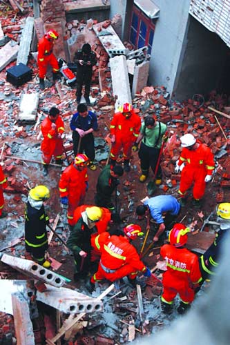 ????在樓房附近干活的其他工人發(fā)現(xiàn)后,趕緊沖到廢墟上,用手扒開磚塊救人。有村民稱,當(dāng)時至少有9個人被村民和在其他地方施工的工人們從廢墟里扒出來,送往醫(yī)院搶救。消防隊員趕到現(xiàn)場之后,一邊用搜救犬尋找廢墟下的生命跡象,一邊和當(dāng)?shù)卣块T搶救人員一起用手和一些簡單的工具清理廢墟。