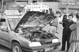 黃石大道離事故現(xiàn)場(chǎng)不遠(yuǎn)處,發(fā)生自燃的出租車。