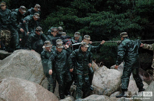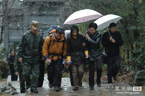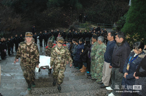 ????2010年12月13日凌晨2點(diǎn)37分,在安徽黃山景區(qū)因迷路被困的18名上海驢友在黃山景區(qū)一個(gè)未開(kāi)發(fā)開(kāi)放區(qū)域被當(dāng)?shù)厮丫热藛T找到,不幸的是,50分鐘后,23歲的黃山風(fēng)景區(qū)公安局民警張寧海在護(hù)送途中不幸墜崖身亡。圖為武警官兵護(hù)送張寧海的遺體。