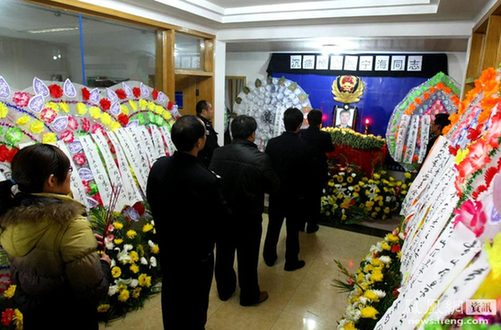????張寧海所在派出所一樓大堂已經(jīng)被布置成靈堂,中央擺放著張寧海的巨幅遺像,20多個(gè)花圈、花籃,團(tuán)團(tuán)簇?fù)碇鴰洑狻⒛贻p的面龐。上千枝黃菊花放在靈堂入口,每一個(gè)進(jìn)去的人都手拿一束黃花,向犧牲的戰(zhàn)友鞠躬。