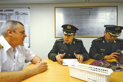 ????昨日上午,記者在前灣港82號泊位見到了 “地中海·利沃爾諾”,并跟隨黃島邊檢站工作人員登船。據(jù)該船船長勒夫勒介紹,這艘貨輪隸屬于“地中?!焙竭\公司,德國籍。