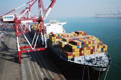 ????昨日凌晨4時,隨著目前全球最大的集裝箱貨輪——載箱量14036箱的德國籍“地中?!だ譅栔Z”輪最后一根纜繩拴上青島港QQCT碼頭82區(qū)泊位,再次刷新了青島港靠泊最大集裝箱船舶的紀錄。昨日中午,該輪駛離青島港,沿途將經(jīng)過寧波、長沙、深圳、新加坡等港口,最后到達德國漢堡港。據(jù)悉,這艘貨輪將每兩個月一個航程,往返于德國漢堡港和青島港之間。